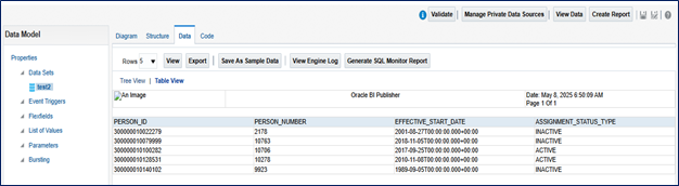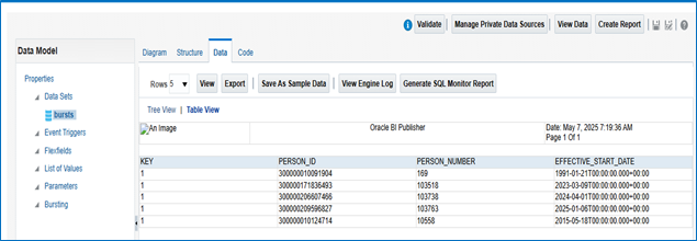 In this query, the key—commonly referred to as the bursting key—plays a crucial role in determining how data is segmented and how reports are distributed to various recipients. A multiple bursting key is used, where the assignment status type remains constant across all records. The report retrieves comprehensive person-related information, including person ID, person number, effective date, and assignment status type. Based on the specified filters, particularly a list of person IDs, the report includes data for those individuals—whether they are active or inactive—according to the assignment status type, as part of a multiple bursting report.
