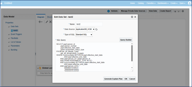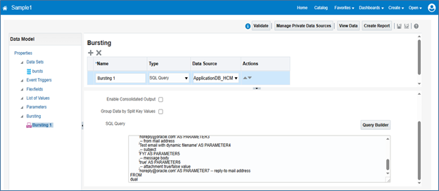 Step 11: Write name –select data Source-Application DB_HCM and write a query for Multiple Bursting Report to get the data which is needed for report under SQL Query Box after that click on OK button.(Instead of Fig 7 –Refer-Fig 29-having the different Data Model for Multiple Bursting)