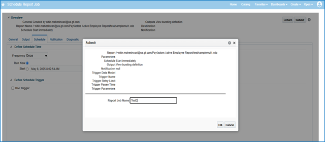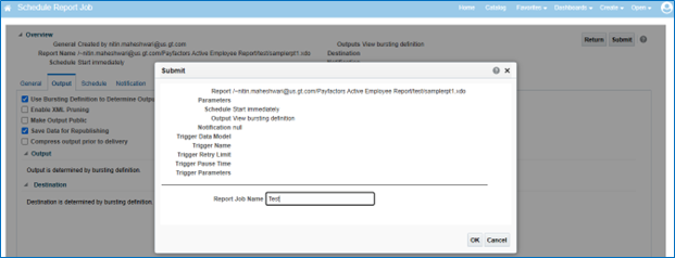 Click on “Submit button then showing the Pop Window –write the name of “Report Job Name”-Click on “OK” button.(Instead of Fig 24-Ref-Fig 32- To Submit the Report Job Name for Multiple Bursting)