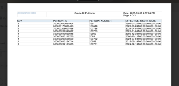 In this query, the key (often called the bursting key) plays a critical role in controlling how data is segmented and how reports are delivered to different recipients. A single bursting key, with a constant value of 1, is used for all records. The report fetches all person-related details — such as person ID, person number, effective date, and assignment status type — in a single bursting report.