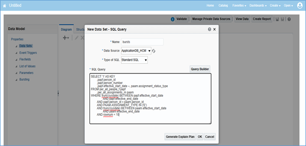 Step 4: Write name –select data Source-Application DB_HCM and write a query for Single Bursting Report to get the data which is needed for report under SQL Query Box after that click on OK button.