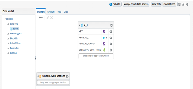 Step 12: Click on Bursting option which is showing last option under properties in left hand side.(Instead of Fig 16 –Refer-Fig 30-using the different Data Model for creating a Multiple Bursting)